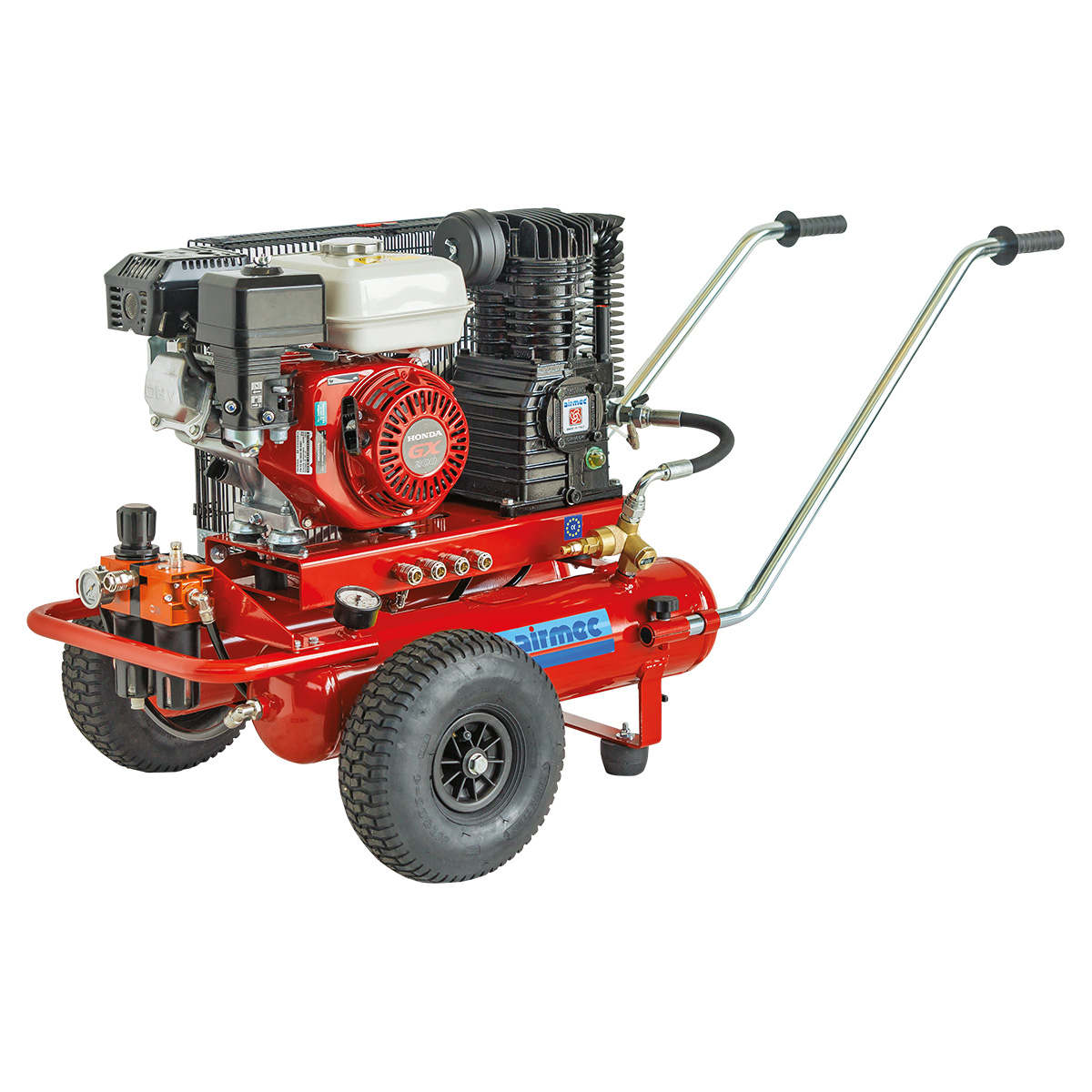 Motocompressore ad alte prestazioni con motore a scoppio a benzina 4 tempi. Avviamento a strappo con fune autoavvolgente. Testata bicilindrica monostadio con cilindro in ghisa ad elevato rendimento d’aria. Valvola automatica di sfiato e messa a vuoto che mantiene la pressione costante nel serbatoio. Completo di filtro- riduttore-lubrificatore, manometro in glicerina e ripartitore con attacchi multipli. Un telaio pratico e maneggevole dotato di ruote pneumatiche lo rende adatto per l’utilizzo in agricoltura.